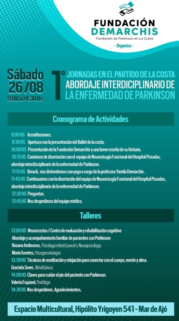 El sábado 26 de Agosto 2023 se han desarrollado las 1ras Jornadas en el Partido de La Costa “Abordaje interdisciplinario de la enfermedad de Parkinson”. El evento tuvo lugar en el Espacio Multicultural de Mar de Ajó, ubicado en Yrigoyen y Sacconi.